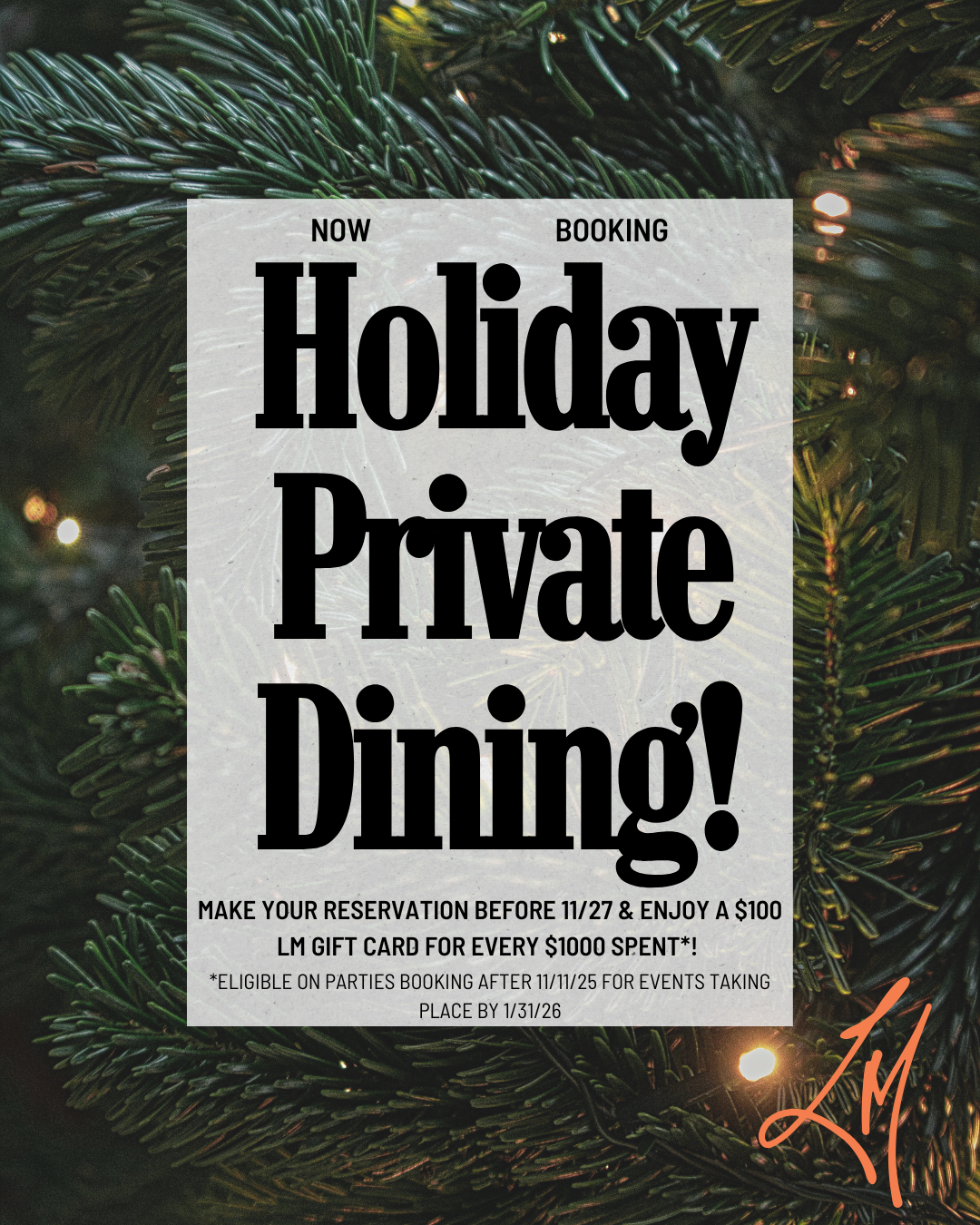 Now through 11/27, we are offering an exclusive holiday gift to our guests. When you book your private holiday party before 11/27, we will give you a $100 LM Gift Card for every $1000 spent.